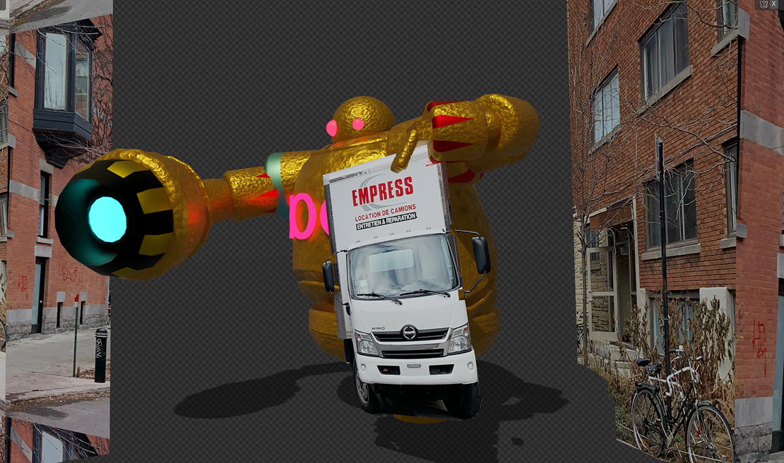 L'environnement a été créé a partir d'une image fourni, que j'ai mis en arrière plan de caméra, j'ai ensuite coupé des sections de l'image pour donner un effet de trois dimension. Pour les ombres j'ai mis un plane affecté par la lumière pour faire une fausse impression que le robot est réelement la.