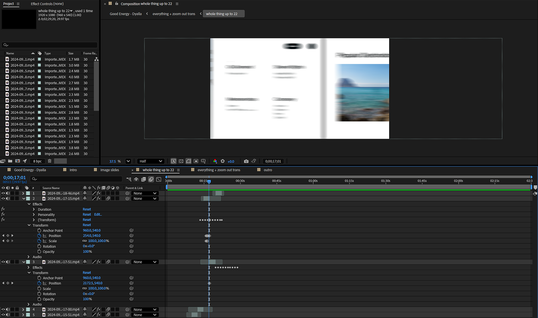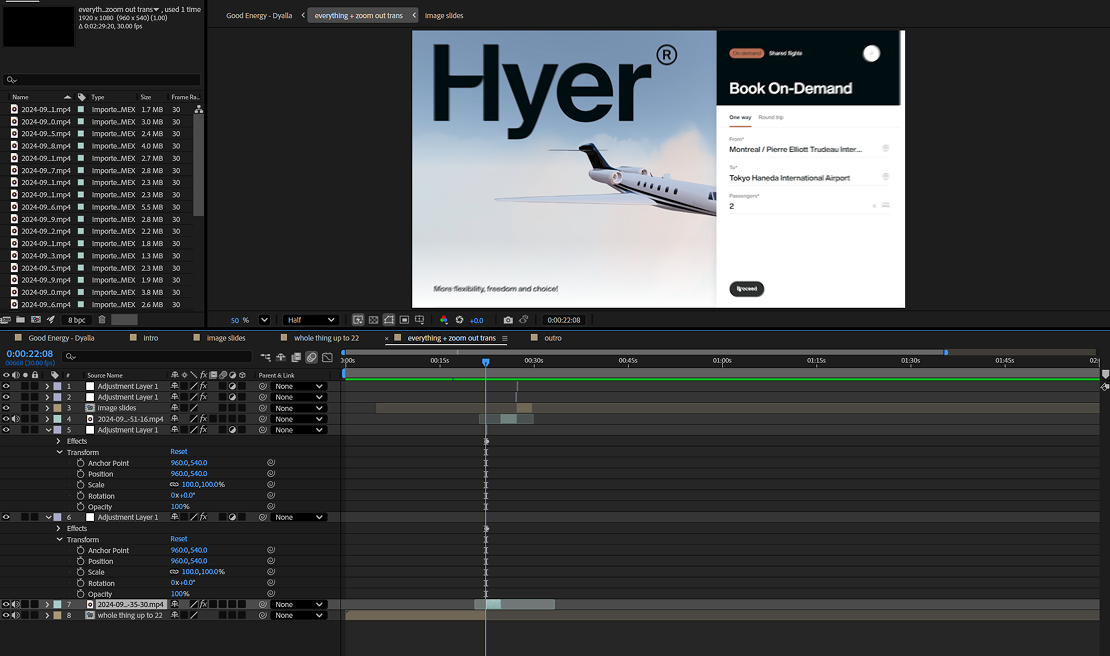 Pour ce projet je voulais que le tout sois fluide, que ca captive l'attention du spectateur, j'ai donc du incorporer des transitions plus rapide, plus "flashy" pour remédier a cela ce qui m'a pousser a faire des recherches. j'ai aussi utiliser des "adjustement layers" pour faciliter le tout.